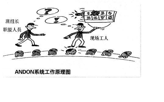 ⑴ 当操作者需要帮助、发现质量等与产品制造、质量有关的问题,他就拉下吊绳或用遥控器,激活Andon系统,该信息通过操作工位信号灯、Andon看板、广播将信息发布出去,提醒所有人注意。