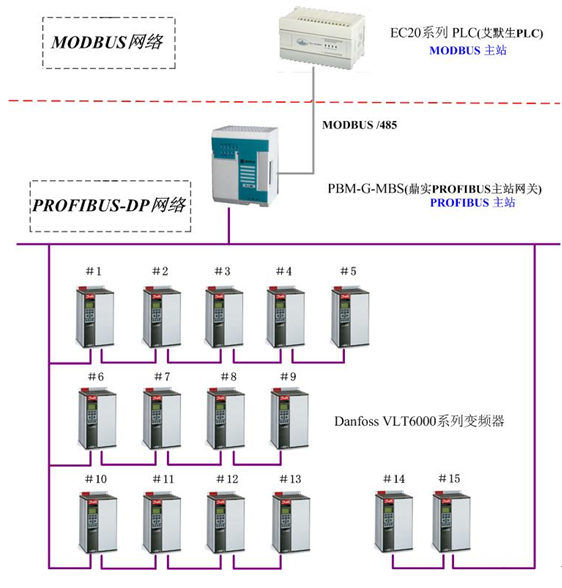 在集散式控制系统DCS中,主控网络有时使用MODBUS协议,远程现场设备使用PRIFBUS-DP协议,这时需要把现场设备的信号传输到主控网络中监控和控制,实现两种不同协议网络间的通讯。此案例就是此类情况,在福建某楼宇的中央空调压缩机电机控制系统中,艾默生EC20系列PLC(MODBUS 主站)需要对现场的丹佛斯VLT6000系列变频器进行监。其中Danfoss VLT 6000使用的是PROFIBUS-DP协议,控制下边的电机。这样就需要用到一种从PROFIBUS到MODBUS协议转换的模块,鼎实的主站网关PBM-G-MBS提供了一种解决方案。