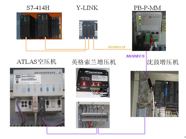 S7-414H冗余CPU通过Y-LINK模块连接在PB-P-MM的PROFIBUS-DP端,PB-P-MM模块作为PROFIBUS-DP的从站,同时作为MODBUS的主站。从PB-P-MM模块出来,首先接入沈鼓增压机。其控制系统是GE的可编程控制器。随后进入英格索兰和ATLAS设备,他们的控制器都是厂家自己品牌的专用通讯模块。