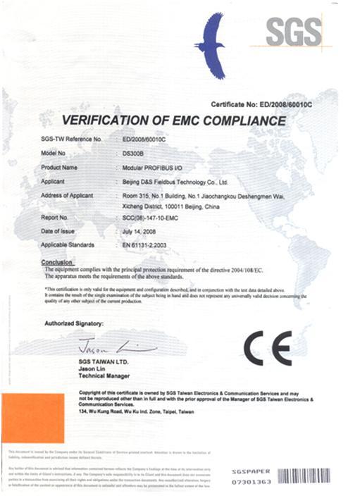 2008年11月鼎实300B系列可扩展式总线I/O顺利通过CE认证