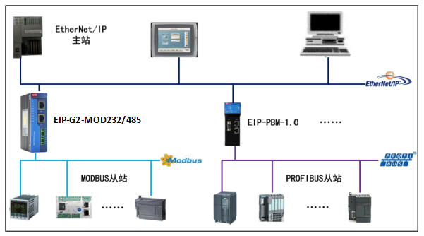 EIP-G2-MOD232/485产品用来实现ETHERNET/IP协议与MODBUS协议的转换。该产品在ETHERNET/IP侧作为Adapter,在Modbus侧作为主站,用来将Modbus从站设备接入ETHERNET/IP网络当中去。产品连接示意如下图所示,