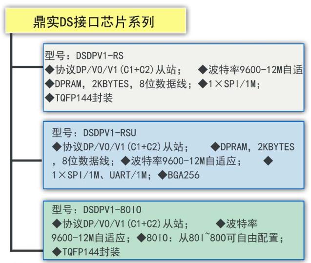鼎实科技自主开发推出DSDPV1及DSPAV1系列芯片及开发包, 为自主开发PROFIBUS产品用户提供快速、简单易学的DP/V0/V1 (C1+C2)功能实现方案。产品型谱说明: