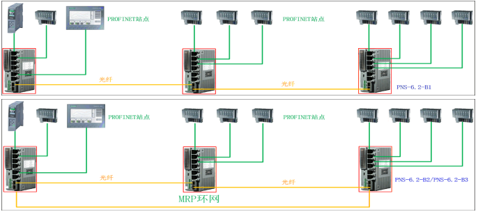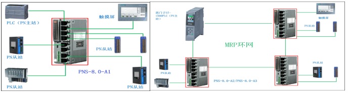 一个小型的PROFINET网络通常由PROFINET主站(PLC)、人机界面(触摸屏)和一些PROFINET从站(IO模块、驱动设备、传感器等)构成,通过鼎实PNS-8.0-A1(8电口)交换机可以实现这些设备的组网,PNS-8.0-A2/A3型交换机可以通过MRP协议将现场设备组成环网。