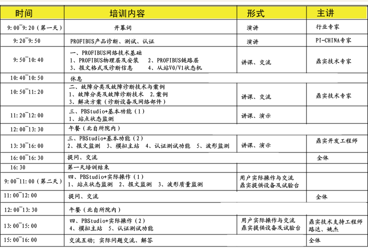 中国经济发展进入新常态,新建项目高潮期已过,已建生产线自动化系统经过几年运转进入维护、整改、技术升级需求新阶段。PROFIBUS在几年前的新建项目高潮中是市场采用率最高的现场总线技术,目前众多用户对PROFIBUS系统诊断与维护服务需求日趋强烈。为此,中国PROFIBUS技术资格中心(北京鼎实创新科技股份有限公司)得到PI-CHINA鼎力支持,在京举办“PROFIBUS网络诊断及鼎实诊断工具PBStudio+技术交流与培训班”,会议邀请行业技术专家讲授案例;鼎实工程师讲授鼎实诊断工具PBStudio+应用及实习操作,为最终用户、系统维护工程师、系统集成工程师及设备开发工程师提供PROFIBUS网络诊断技术的交流平台,及鼎实诊断工具PBStudio+应用操作培训。